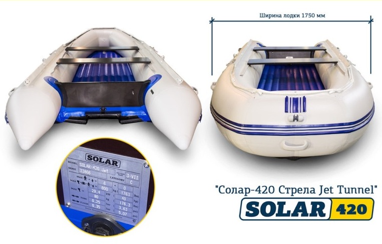 Надувная лодка Solar (Солар)-420 Strela Jet tunnel Серый Артикул:00-00078509 Длина внешняя, см:420 Макс. мощность мотора, л.с.:30 |