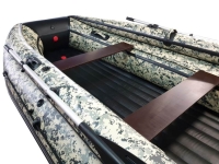 Такое дно уже встроено в лодку, V- образное надувное дно, объемно вклеенное в борта и нос лодки по двум линиям, что придает конструкции жесткость, сравнимую с RIB. Жесткость днища при надувании достигается не из-за давления, а благодаря установленным вертикально и продольно внутри дна переборкам, изготовленным из ткани имеющим нулевые остаточные удлинения. На сегодняшний день лучший вариант из надувных полов.