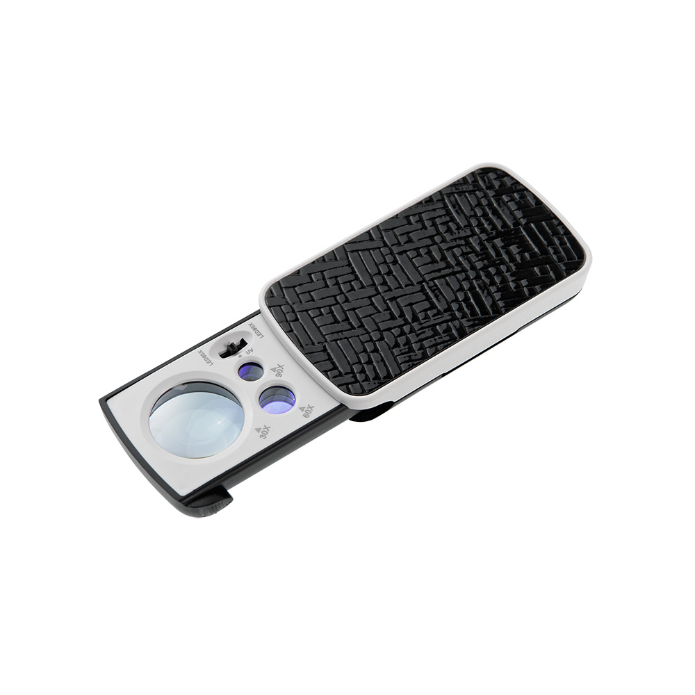 Корпус лупы и оправа изготовлены из пластика. Оправа с линзами сдвигается внутрь корпуса, при этом, в сложенном состояние лупа занимает место не больше спичечного коробка. Подсветка автоматически включается при выдвижении блока с линзами в крайнее положение. Сверху на оправе предусмотрен переключатель подсветки: подсветка поля 10-кратной линзы, подсветка поля 30-кратной линзы и УФ подсветка (только для поля зрения 10-кратной линзы).